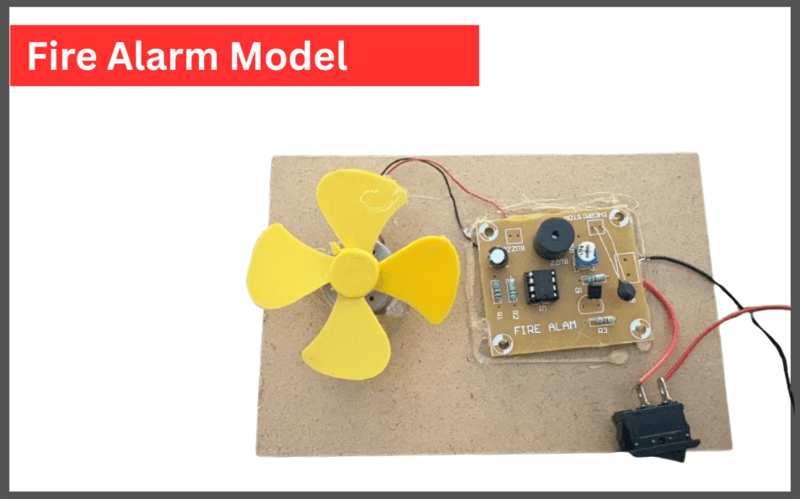 Simple fire alarm project model that detects heat and triggers an alarm with fan activation. Ideal for school science exhibitions and basic electronics learning.