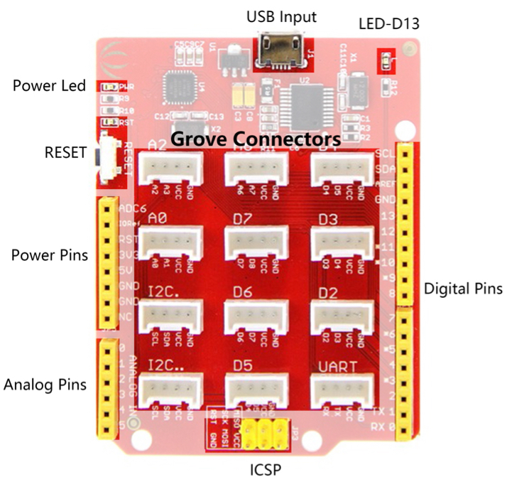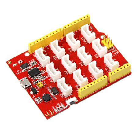 The board includes 14 digital I/O pins (6 with PWM support), 7 analog inputs, an ICSP header, a micro USB connection, and 12 Grove connectors, making it perfect for rapid prototyping and IoT applications. The built-in Grove interface allows easy plug-and-play sensor and module integration, reducing wiring complexity.
