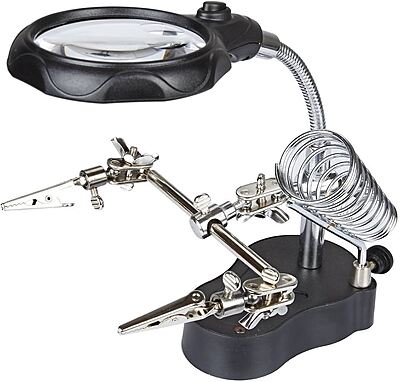 Make soldering and electronics work easier with this Soldering Stand with Helping Hand Magnifier and LED Light. It is designed to securely hold PCBs, wires, and small components while providing better visibility through a magnifying lens and focused LED lighting.